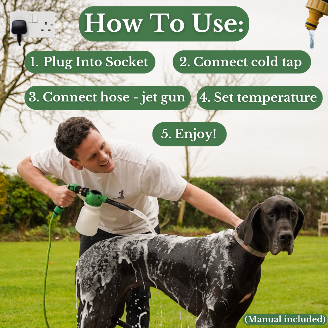 - Plug into a socket, connect your garden hose pipe and enjoy warm water from any outdoor tap